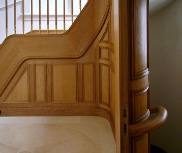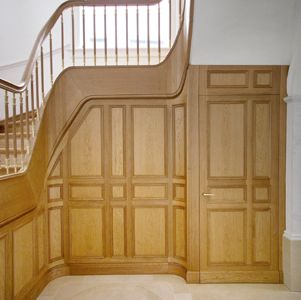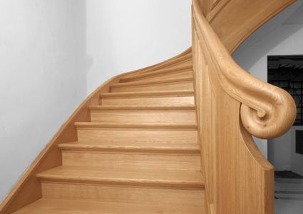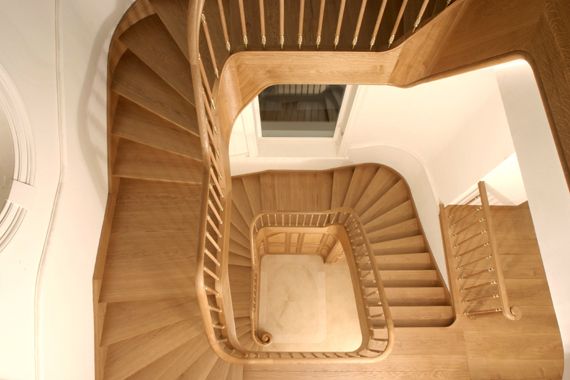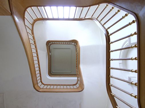 Für das Treppenhaus eines Hauses in Hamburg/Harvestehude hatten wir den Auftrag, eine scheinbar freitragende Treppe zu bauen, die aus Brandschutzgründen auf eine Betontreppe aufgesattelt wurde. Dabei ist der gesamte Beton komplett verkleidet worden. Eher ungewöhnlich war der Wunsch des Kunden, die Podeste in die geraden Läufe und die Stufen in die Ecken zu positionieren. (Traditionell ist die Anordnung umgekehrt, da der Bau einer Treppe so erheblich einfacher vonstatten geht.)